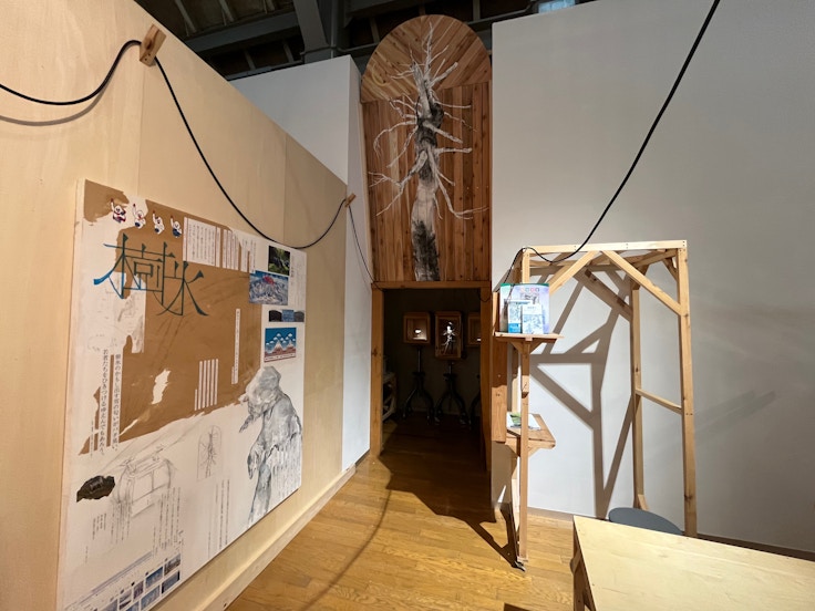 東北芸術工科大学の1階エントランスでは、「ひとひのうた」の入口ともなる展示《未明-あちらとこちらのあわい》が行われている。これは本展でも大きく取り上げられている山形・上山出身の歌人・斎藤茂吉による短歌21首を背景に、画家・春原直人による蔵王連峰をモチーフとする絵画を展示。さらに、時人・管啓次郎による16行詩と、美術家・山本桂輔による丸太を素材とする彫刻も並ぶ。これらは蔵王温泉での「ひとひのうた」へと、来場者をいざなう越境の魅力を伝えるものだ。