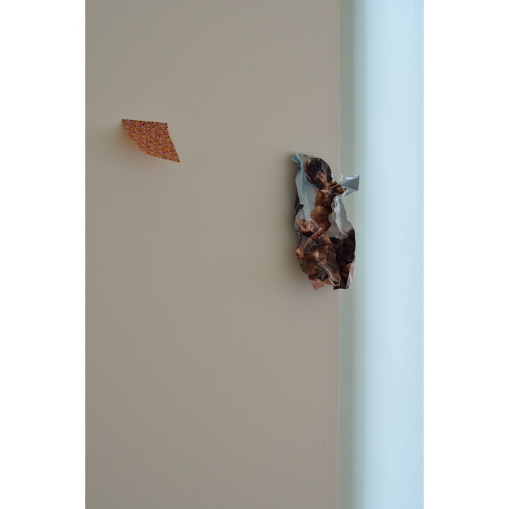 いっぽう、東博では見られないモチーフも銀座メゾンエルメス フォーラムには存在している。ひとつは一輪の花。花瓶に生けられたこの花はいまは美しく咲いているが、いつかは必ず枯れ、なくなってしまうだろう。もうひとつは笑顔のモデルが写されたくしゃくしゃの雑誌の1ページ、そして「生の光景」を静かに見つめる、木の人の存在だ。