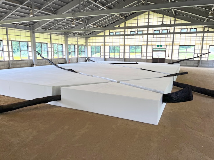 ソン・ミンジョンは美麻の二重地区にある屋内ゲートボール場で作品を展開。台風で倒れかかった木を焦がし、発泡スチロールと組み合わせた《黒い跡》を制作。本作は雪の上に樹が倒れたようにも、雪を熱をもった樹が溶かしたようにも見えるが、ソンは、近年メディアを通じて多く目にする山火事を、より生々しく私的なものとしてとらえてほしいと考えて本作を制作した。