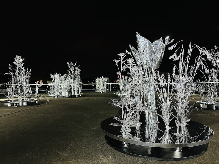 有料会場となる「東北沢駅屋上」では、ベルリン拠点のアーティスト・三家俊彦によるインスタレーション《"The Aluminum Garden-Structural Studies of Plants-"》が展開されている。工業用アルミホイルによってつくりだされた植物は、植物の構造を参照し、植物らしいしなやかさや脆弱性を残したもの。風に吹かれる場所に置くことで、環境に影響されて植物のように姿を変える。都市の中に置かれることで、人と自然の共存のかたちを探ろうとするものだ。