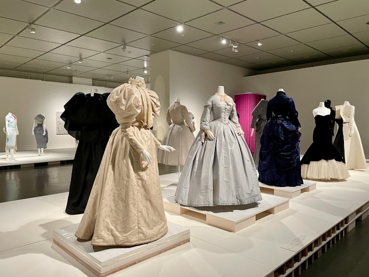 第2章「きれいになりたい」では、コルセットや膨らんだ袖のドレスなど、各時代の理想的なシルエットを追求した衣装が展示され、それぞれの時代の美しいとされるフォルムを自身の身体に重ね合わせるという欲求を反映している。これらの衣装とあわせて、スイスのアーティスト、シルヴィー・フルーリーのインスタレーション《No Man’s Time》と《フィッティング・ルーム》(いずれも2023)も紹介されており、ファッションや消費社会、そして「私をきれいにしたい」という欲望との関係を探求している。
