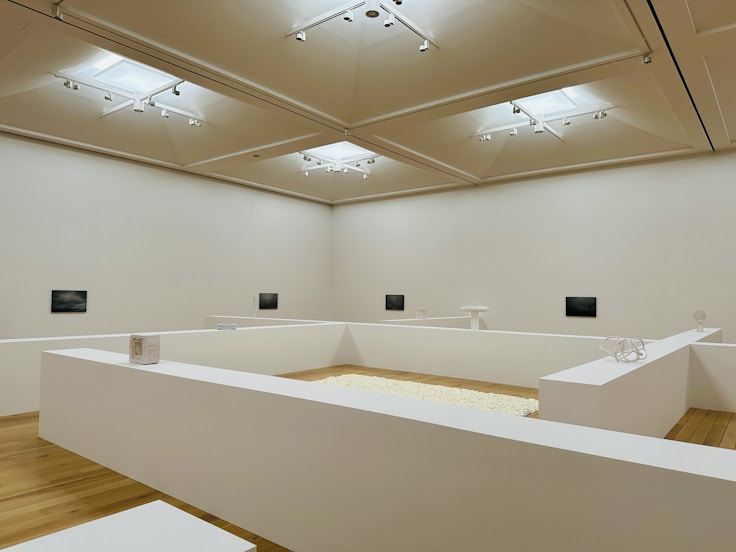 展示室には高さ1メートルの白い塀が巡らされており、それが空間を9つのセクションに分けている。この塀自体も巨大なひとつの作品《ラビリンス断片》(2024)で、空間全体を作品化したともいえる、西川の建築にも携わる側面が反映された構成だ。塀は空間を分断しつつも、その低さゆえに空間同士をつなげる役割も果たす。また彫刻作品の台座として機能することも大きな特徴だ。