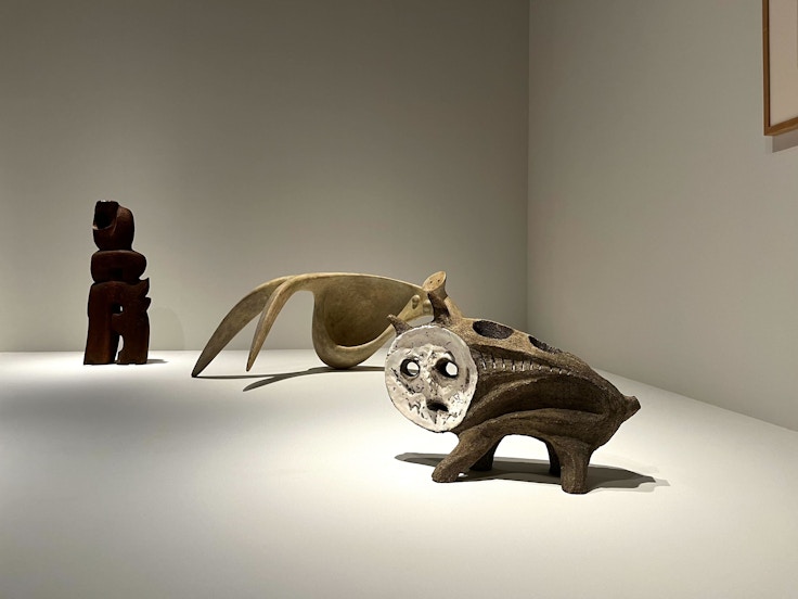 大展示室中央には、イサム・ノグチや岡本太郎らによるテラコッタや陶の作品群が並んでいる。古代遺物にも見受けられる「土からつくる」といった原初的な造形方法にアーティストたちが立ち返ろうとする様子とも受け取ることができるだろう。