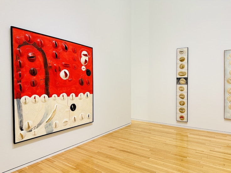 第2章で紹介されるのは、具体時期の初期作品だ。63年、松谷はグタイピナコテカで新素材となるビニール系接着剤(ボンド)を駆使した作品をまとめて発表した。ボンドにストローによって息を吹き込むことで、官能性や生命性を持つフォルムが生み出されている。細胞を思わせる有機的なモチーフが強い存在感を示す。