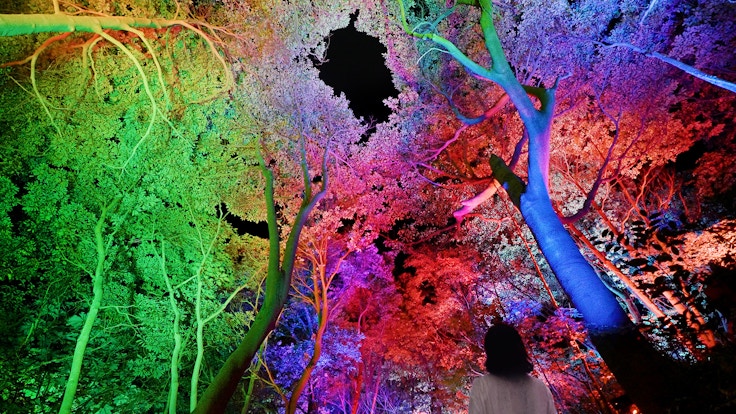 人や森の動物の動きを感知して光や音を生み出す《幽谷の呼応する森》。一面の緑に包まれる普段の山歩きももちろん面白いが、移り変わる色や響く音によって、より森のなかの生命に着目することができるだろう。
