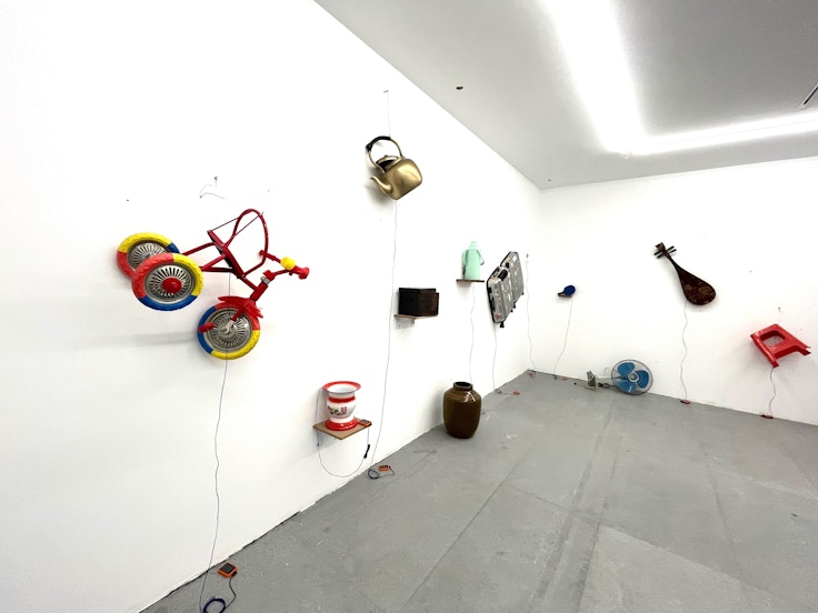 「それは変化し続ける」「それはあらゆるものと関係を結ぶ」「それは永遠に続く」という3つのコンセプトのもとに、発光ダイオード(LED)を使用した作品などを制作してきた宮島達男。本展では《Counter Voice Network》と名づけられた、音についての作品をひとつの展示室を全面的に使用して展開した。壁面に設置されているのは、やかん、スーツケース、扇風機、三輪車といった身の回りの品々だが、それらには小さなスピーカーがつながっている。スピーカーからは様々な言語によってカウントダウンをする音声が聞こえており、展示室内ではそれら音声が響き合い、また散りばめられた日用品のイメージとともに、様々な記憶が喚起される。