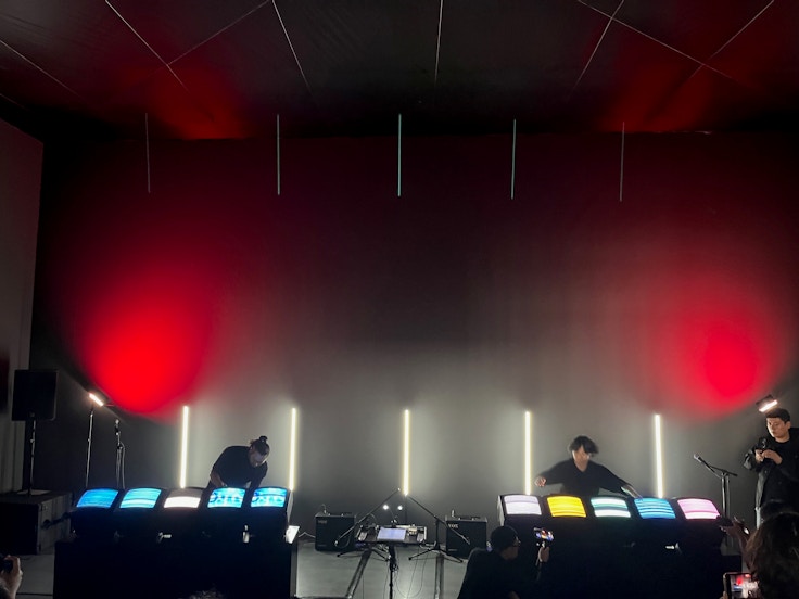 第18回文化庁メディア芸術祭アート部門優秀賞を受賞するなど、すでに国内では高く評価されてきた坂本龍一と真鍋大度による《Sensing Streams》も、本館の広大な展示室で展開されるとことなった印象を受ける。通常の生活では知覚することのできない「電磁波」をセンシングし、可視化・可聴化する本作。ダイヤルを回し、周波数を変えることで、身の回りで飛び交う電磁波が、立体的な音響と高精細な巨大なディスプレイによって明瞭なかたちをもって立ち上がる体験は、テクノロジーによって計画的な都市づくりが進む中国で見るとき、より多層的な意味が発生していた。