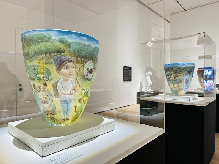 田中信行は、漆の「漆黒」を用いて、ゴーストタイプポケモンの技である「かげうち」を表現。高さ2メートルもの作品は吸い込まれるような黒さをたたえている。いっぽう新實広記は、こおりタイプの「つららおとし」をガラスで表現している。