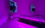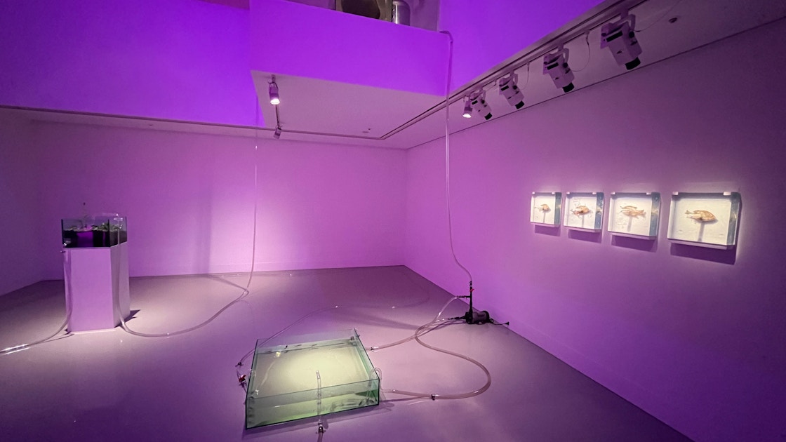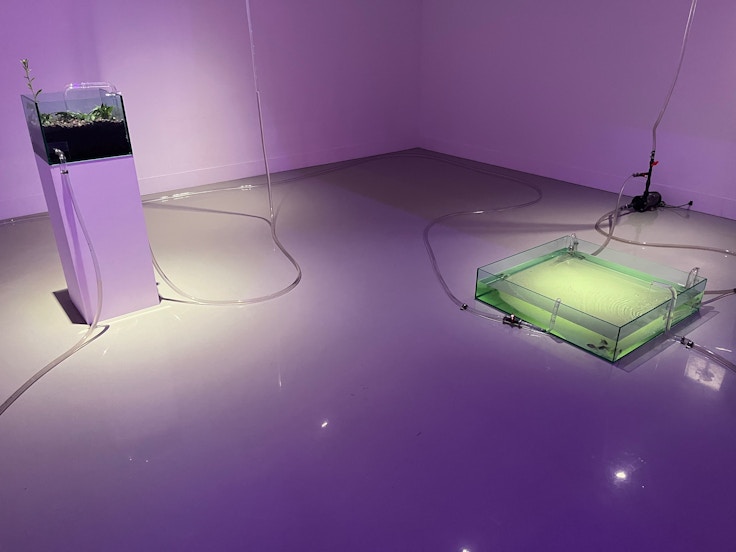 本展で渡辺は水槽やプランターなどをホースでつなぎ、水やバクテリアを循環させて自律した生態系を構築する代表作《Sans room》(2017〜)を中心に、連関するような作品を展示している。本展の《Sans room》は過去最大規模の規模となっており、ギャラリー全体に張り巡らされたホースと水槽によってつくりだされている循環は圧巻だ。まずはその概要を紹介したい。