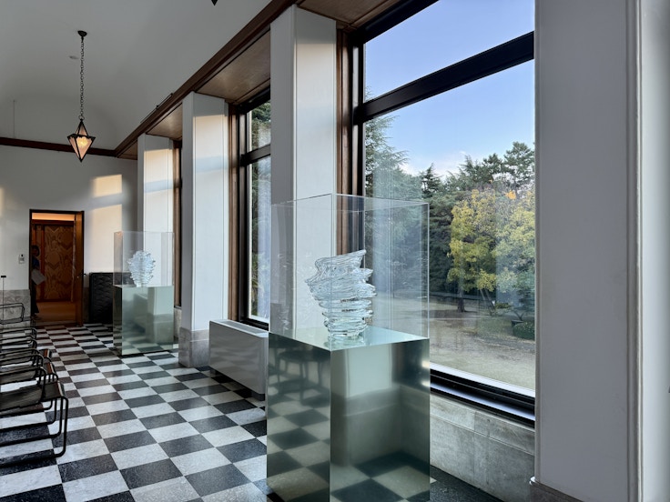 青木は、本展で鉄を溶断する際に現れる「透明な光」にインスパイアされた作品を展示。重厚でありながら有機的なフォルムを持つ作品群は、旧朝香宮邸の装飾と対話しながら空間を豊かにしている。また、通常は作品のパーツにおいて透明なガラスを用いる青木だが、今回は個人的な歴史や記憶を反映させた赤いガラスも使用されており、「昭和の歴史を宿す旧朝香宮邸に向き合うことで、自身の家族や過去を見つめ直した」という。