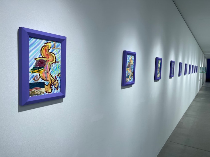 展示室を結ぶ長い廊下に並んでいるのは、ドローイングシリーズ《クジラの地理的身体ドローイング1-10》(2020)だ。本シリーズはにおける捕鯨の歴史をモチーフにしたもので、画面中央には躍動するクジラが、その周囲にはクジラを捕えるモリが描かれている。コロナ禍において現地でのリサーチが困難ななか、自らの身体との連続性を意識しながら捕鯨について描いた作品群だ。