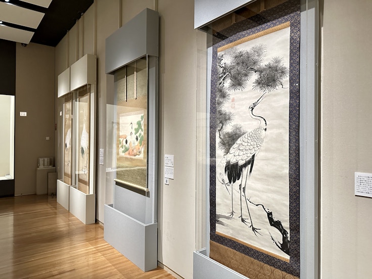 会場には人気の伊藤若冲も並ぶ。若冲といえば鶏が知られるが、鶴の作例も多い。鶴は不老不死の仙境・蓬莱山に住むとされ、長寿のシンボルだ。若冲の《鶴図》(18世紀、個人蔵)はつがいの鶴が松とともに描かれたもので、のびやかな筆致が見どころとなっている。