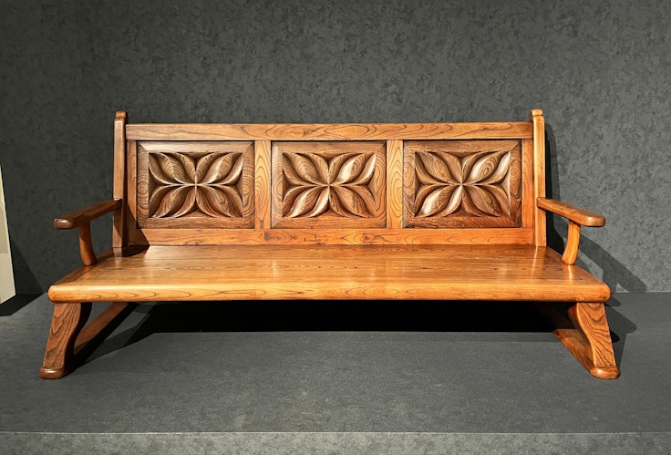 黒田の木工芸作品と言えば、全体的な佇まいや装飾からうかがえるおおらかさが印象的だ。とくに彫りのデザインは朝鮮家具の特徴を取り入れながらも、そこに自身のアイデアを組み込むことで独自のものへと進化させている。また、黒田が好んだ技法のひとつに「拭漆」が挙げられるが、この手間のかかる技法を取り入れることで、素材の持つ魅力をより引き出している。