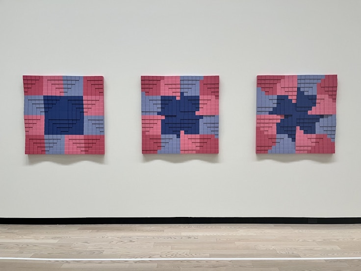 「2 色影レリーフ」や「3 網の構造と空白の中心」では、コンクリート・アートにおいて色表面の転換と連続性に取り組んだ作品群や、そこから派生した立体作品を紹介。なかでもわずかな凹凸の側面にのみ着色を行った「色影」シリーズは、見る角度のよって色が変化するといったもので、吉川による空間や瞬間(時間)に対する視点が表れている。