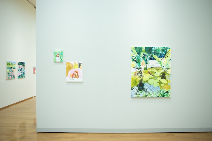 展示は3章で構成される。第1章は「Gardens」。2023年から2024年にかけて描かれた油彩画を中心に、3つのスペースに分けて展示される。同じテーマやモチーフ、色やかたちの共通点などに着目した小西自身のアレンジで、作品同士がさまざまな関係を結びながら展開を見せる、色彩豊かな「空間絵画」が生まれた。2024年に描かれた《Water Fountain 1》から展示へと誘われる。