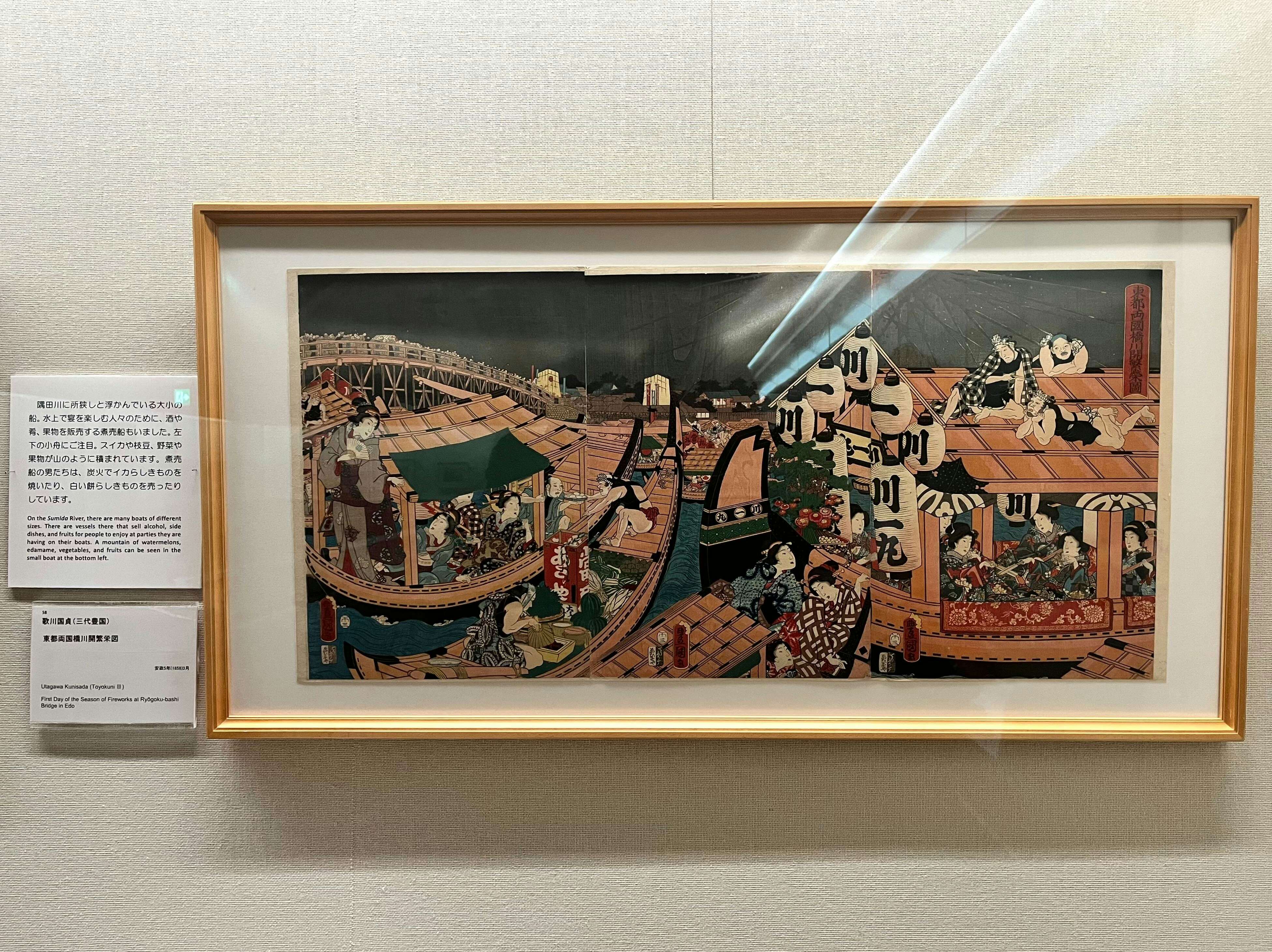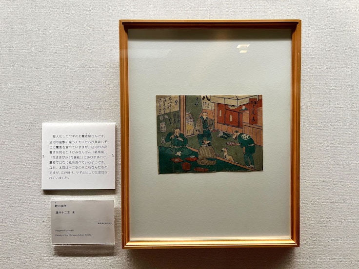 1つ目のセクション「さまざまな料理」には、そば、寿司、鰻、天ぷらなど、現代でも人気の料理を食べる江戸の人々が描かれた作品がずらりと並ぶ。例えば、四代歌川国政による《志ん板猫のそばや》は、擬人化されたネコたちが蕎麦屋で食事をしている風景が描かれている。ユニークかつ可愛らしくあるとともに、当時の人々がどのような食事をしていたのかが垣間見えるものとなっている。