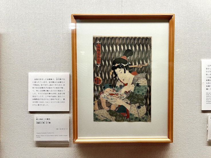 料理を一通り楽しんだ後は、スイーツも食べたくなる。歌川国貞(三代豊国)が描いた《誂織当世島 金花糖》には、現代では少し珍しい「金花糖」という砂糖菓子が描かれている。金魚のかたちに固められた金花糖は彩り豊かで可愛らしく、当時の人々にも愛されたという。