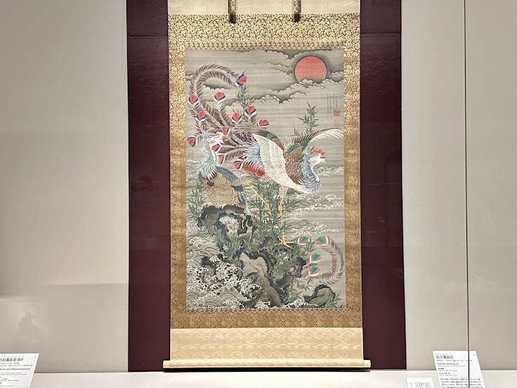 伊藤若冲の《旭日鳳凰図》(1755、展示期間〜2/2)は想像上の鳳凰が見事な描写によって細密に描き出されており、色鮮やかな羽を持つ雌雄の鳳凰が神々しさを放つ。