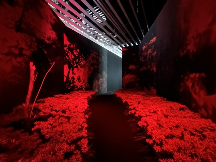 鮮やかな赤一色で彩られた《Flowers of the Beyond》を構成するのは造花の彼岸花。彼岸花は古来より、生と死、此岸と彼岸の間を漂う象徴的な存在とされている。赤い花々の中を通り抜けることで、五感全体でその象徴性を体験することができるだろう。