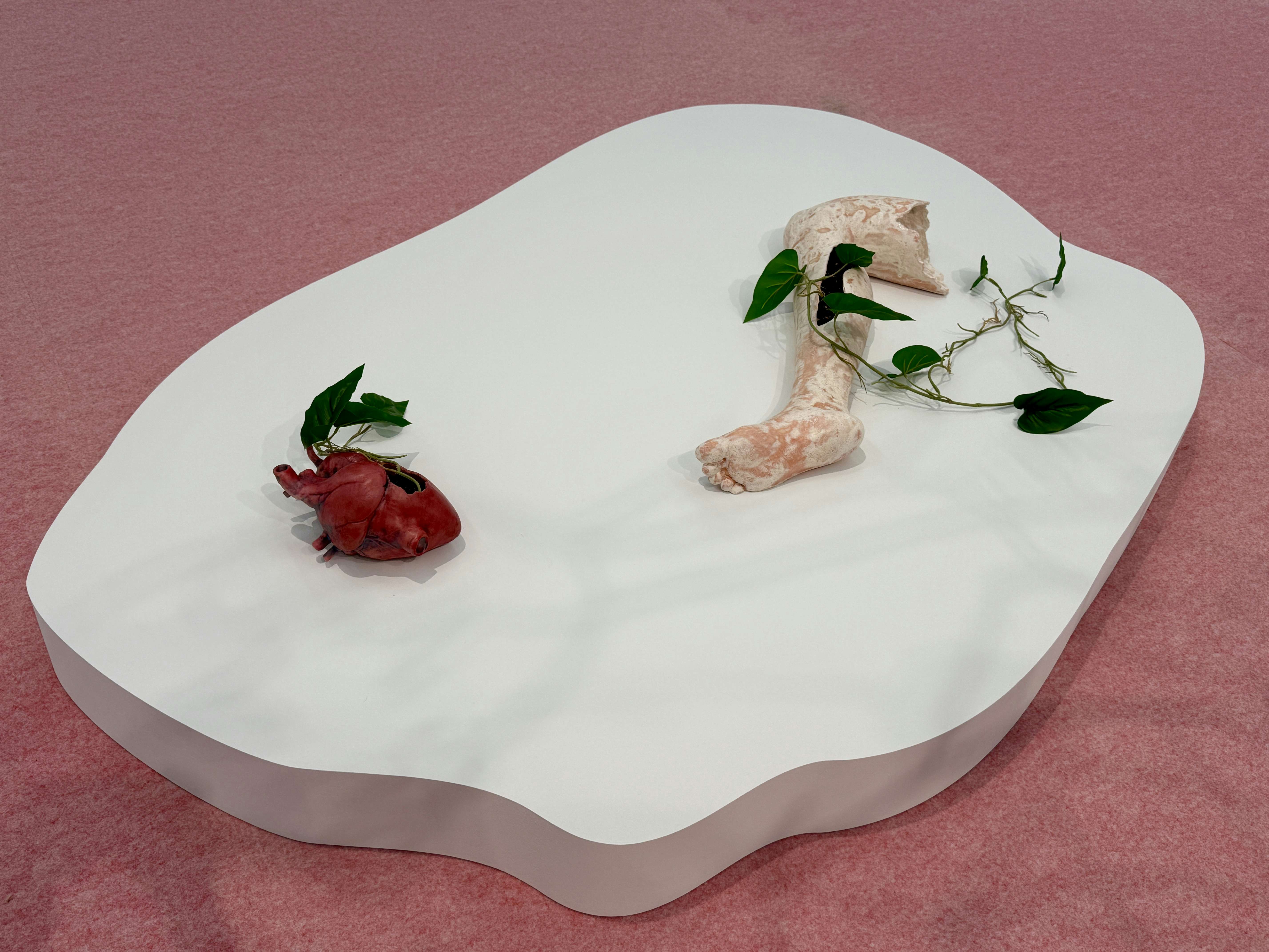 いっぽうの「Bandoengsche Kinine Fabriek」は、バンドンにおけるキニーネの歴史をたどる展示だ。キニーネはマラリアの特効薬として知られ、19世紀末にはバンドンが世界一のキニーネ生産地となった。オランダ政府主導で建設されたキニーネ工場は、第二次世界大戦中に日本軍に接収され、後にインドネシアの国営製薬会社となった。インスタレーション作品《Bandoengsche Kininefabriek》(2024)は、マラリアの感染経路の一部として蚊が人の体内に入り、血流を通じて繁殖し感染が広がる様子を表現した作品。また同作には、キニーネ工場に関する資料やトニックウォーターや精力剤として商業化されたキニーネの側面も組み込まれている。