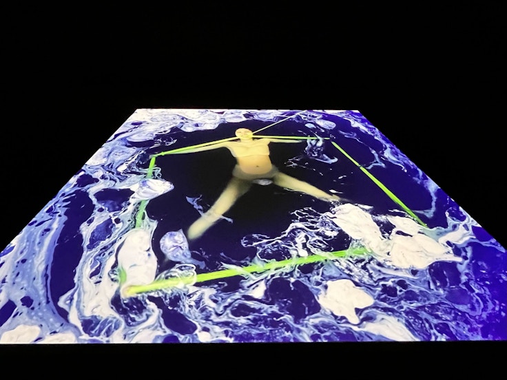 タイのバンコクを拠点に活動するカウィータ・ヴァタナジャンクールは、労働及び女性の家事労働に焦点を当てて制作を行ってきた。今回出展されている《A Symphony Dyed Blue》は、洋服工場から流出した化学染料によって汚染される川を記録したドキュメンタリー《River Blue》(2017)にインスパイアされたもの。青い染料と白い泡で満たされた有毒性のある水のなかで、自身の身体を用いてその過酷な労働状況を表している。