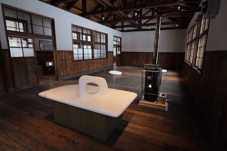 さらに、貸しギャラリーとして使われている部屋にも、中央に安田の作品が鎮座する。木造校舎と安田の作品を活かしたサイト・スペシフィックな展示が可能なこの空間は、小中学生の作品展から現代美術展まで様々な展覧会を開催している。