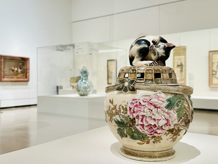 なかでもハイライトとなるのは、土産物としての絵画を制作する五姓田芳柳のもとに生まれた洋画家・五姓田義松や、女性が美術を学ぶ機会は長く限られていたなかで絵画を学び、大成した義松の妹・渡辺幽香の絵画だ。また、京都から横浜に移り住んで窯を構えた宮川香山による高浮彫の《高浮彫牡丹ニ眠猫覚醒大香炉》(明治前期)など、横浜ゆかりの陶磁器作品も並ぶ。