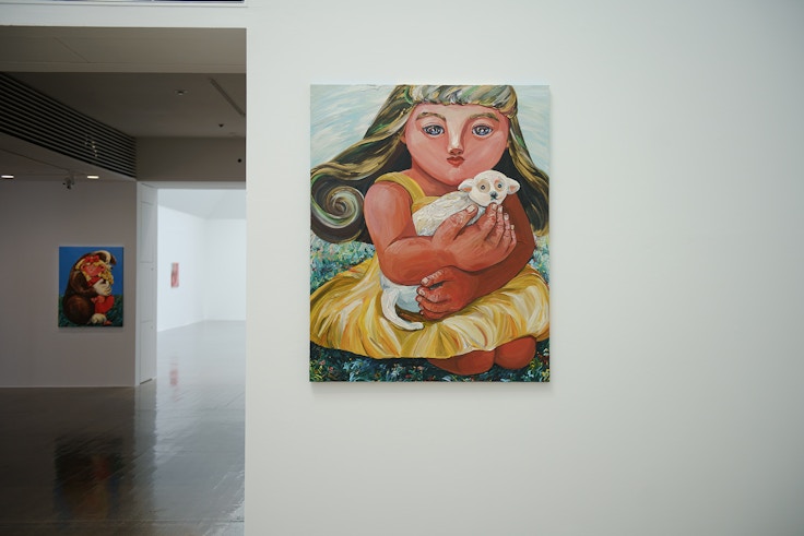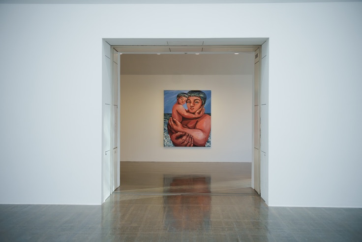 展示室を抜けたところに、抱き合う親子を描いた《Planets》を展示。冒頭に展示されていた新作《ザ・オーケストラ》であらゆる生き物がともに音楽を奏でているように、展示全体を通して、平和や共生への思いが伝わってくる。色とかたちに込められた生命感、躍動感を全身で体感し、そんな作家の思いへの共感が内部に湧き上がってくるような力に満ちた個展に足を運んで欲しい。絵具で描かれた物質感を伴う実際の作品からは、イメージとはまた異なるエネルギーを感じられるはずだ。