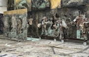 作品は重ねられたキャンバス上に金箔、加工金属、ドライフラワー、布、鉄、木炭などの多様な素材を組み合わせて表現され、枯れたバラは床にも広がる。とくに強烈な印象を与えるのは、分厚く塗り重ねられた絵の具と粘土の層で覆われ、キャンバスから突き出すように掛けられた制服だ。制服を前にすると、1969年にキーファーが父の軍服を着てナチスの敬礼を模した写真が想起される。