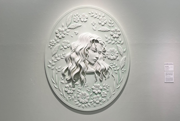 「憧れのイケメン」をレリーフとして制作する𠮷田芙希子は、美しい人物を髪の毛のウェーブからまつげの一本一本まで精細に掘り起こした《Go into the medaillon》を展示している。しかし、頭部のみのその人物は無機質な表情で俯き、またレリーフの大きさもやや過剰と言える。誰の手に渡ることも拒否するようなこの作品が、既存の美術史に問いかけることは何か。