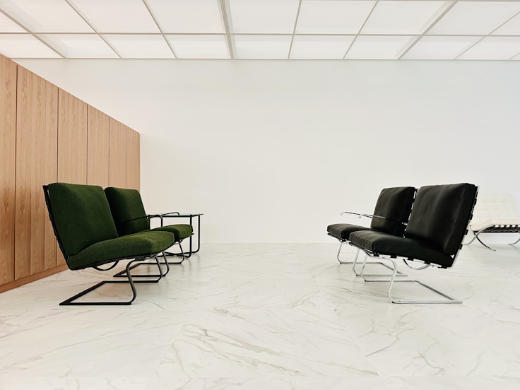 空間の内部にはミースの名作「バルセロナ・チェア」をはじめとする家具も配置されており、一部は実際に座ることもできる。中庭の空間は6分30秒周期で照明が刻々と変化し、24時間の光の変化を擬似的に体験することも可能だ。