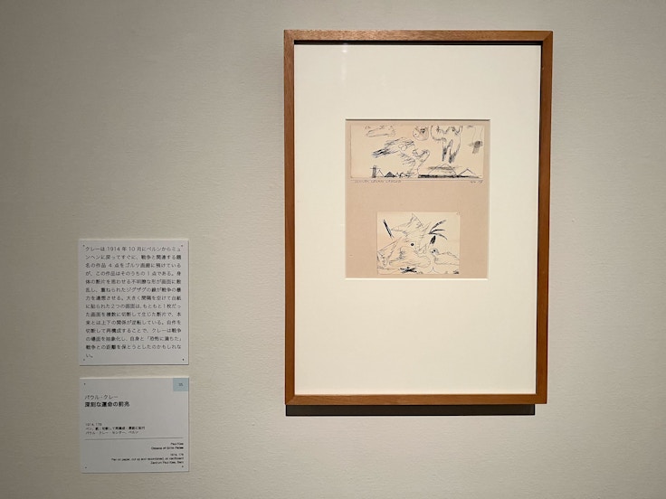 しかし、同年に第一次世界大戦が勃発すると、クレーの色彩への関心が途切れ、戦場のイメージが想起される作品が描かれるようになる。クレーは当初、直接的な戦争の影響を受けていなかったものの、ともにチュニジアを旅したマッケは従軍ののち戦死、カンディンスキーも母国のロシアに帰省せざるを得なくなるなど、青騎士のメンバーは戦争をきっかけに離れ離れとなってしまう。このような悲劇がありつつも、それを直接的に描くことができないといった複雑な葛藤のなかで生まれた表現も、3章「破壊と希望」の作品のなかには見受けられる。