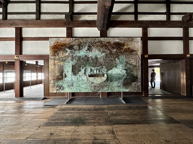 《オクタビオ・パスのために》の隣にあるガラスケースの作品《月のきるかさの雫や落つらん》(2018-24)は、江戸末期の尼僧で歌人・大田垣蓮月の詩に着想を得たもの。巨大なケースの中にはキーファーのパレットが吊るされ、その下部には破損した絵画用の木枠と鉛の枕などが積み重なる。
