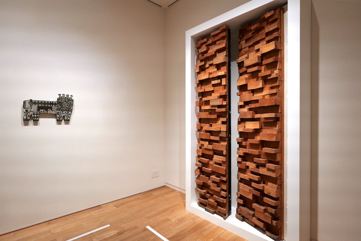 そのとなりにはヴィルカラの妻、ルート・ブリュックのユニークな陶製レリーフ《ライオンに化けたロバ》が展示されている。本作はスタジオに飾られていたもので、ブリュックが夫であるヴィルカラをモチーフに制作したものだとも言われている。本作をはじめヴィルカラは妻の作品を数多く収集していた。このような夫婦の関係も、ヴィルカラの創作を考えるうえでは、重要な要素になるだろう。