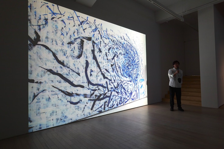 まず、本展の目玉のひとつである新作《夏の海の部屋》(2025)を紹介したい。4Kプロジェクターのスクリーンで上映される本作は、昨年、本展が神奈川県立近代美術館 葉山で開催されていた際の滞在制作によって生まれた作品だ。石田は同館の海が見える展示室で、ドローイング・パフォーマンスを行った。昼は陽光が差し込み、夜は闇に包まれるという時間の流れのなかで、絵画が完成に近づいていく様子が映像化されている。本作を見れば、石田の興味が絵画の持つ時間性をどのように定着させるのか、という点にあることがよくわかるだろう。