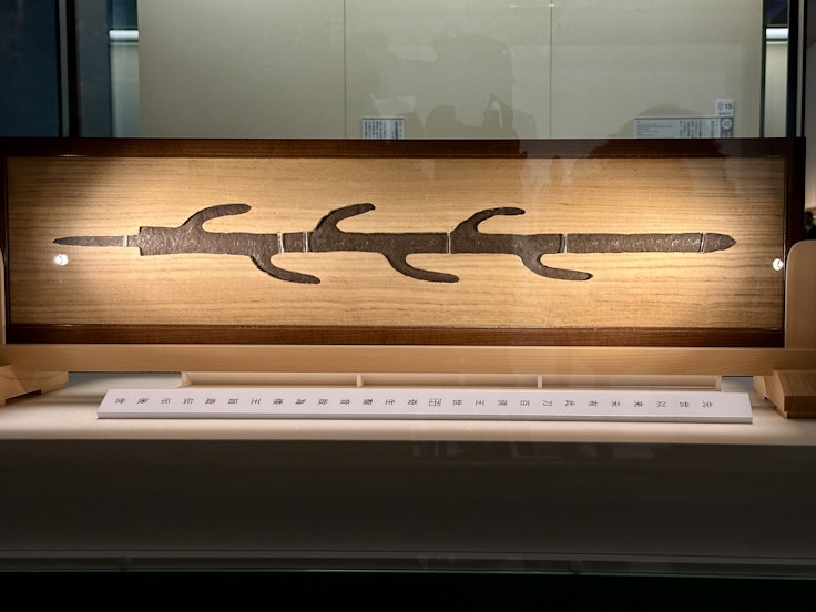 第五章「神々の至宝」では、百済王が倭王のためにつくったとされる《七支刀》(古墳時代)が目玉。異形の鉄剣は、百の兵を退ける威力を持つとされている。