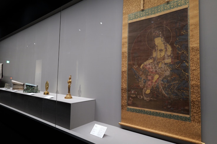 キーワード1「神仏のかたち–光の国から」では、仏教や神道をはじめとする、東アジアの仏教美術の名品の数々を展示。重要文化財の徐九方《水月観音像》(1323、高麗)や、運慶に連なる慶派仏師の手によると思われる《毘沙門天立像》(13世紀、鎌倉時代)などの名品が並ぶ。
