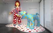 1階エントランスでは、本展のアイコンとして少女像《ヤヨイちゃん》と犬の《トコトン》(ともに2013)が来場者を迎える。また、ここでは幼少期から幻覚や幻聴に悩まされた草間の半生をつづったエッセイ「わが魂の遍歴と闘い」から引用されたフレーズも展示されており、一見可愛らしい少女と犬が、こうした草間の病との闘いの経験から生まれていることが示唆される。
