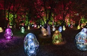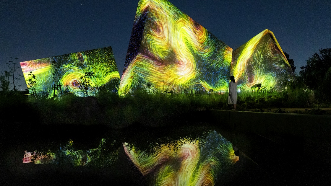 当園にはリニューアルオープンを機に、チームラボの夜間限定の常設展「チームラボ ボタニカルガーデン 大阪」がオープンした。昼間だけではなく夜にも幻想的な植物園を体験できるようになり、海外観光客からも注目されている。常設作品のほかにこのライフガーデンで季節限定の作品が公開されるのも風物詩となりつつあり、今年も展示が始まった。「生命は闇に浮かぶまたたく光―ネモフィラ」と題された作品は、人の動きに反応し、音とともに闇にネモフィラの花が青く発光するように見える。
