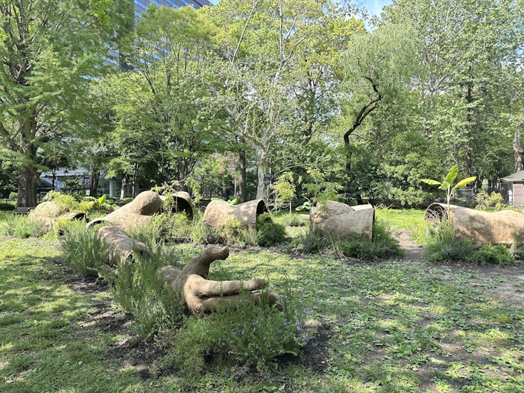 久保は草地広場でもう一つの作品《ハイヌウェレの彫像》を見せる。縄文土偶をモチーフにした本作は仰向けに寝そべった女性型の鉄の構造体に約800kgの土を塗ったもの。縄文土偶はほとんどが女性型をしており、多くがその一部が意図的に破損された状態で見つかっているという。理由は諸説あるものの、久保は「壊した土偶の断片を土に撒く事で豊穣を願っていた」という説に注目した。