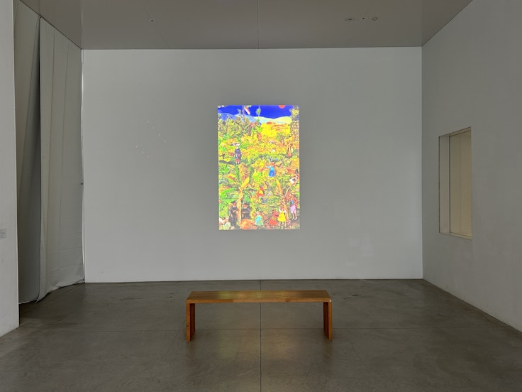「大正生まれの架空の三流画家であるユアサヱボシ」という設定で絵画制作に取り組んでいるユアサエボシは6作品を展示。例えば《奇形卵》(2024)は日本の国旗のメタファーのようであり、戦後アメリカの傘の下で発展を遂げた日本の姿を示唆する。また《夢》(2021)は、「ユアサヱボシ」が見た夢をもとに描かれたもの。戦争ごっこをする子供が犬が操縦するロボットに立ち向かう様子は、第二次世界大戦中の旧日本軍のゲリラ戦を想起させる。