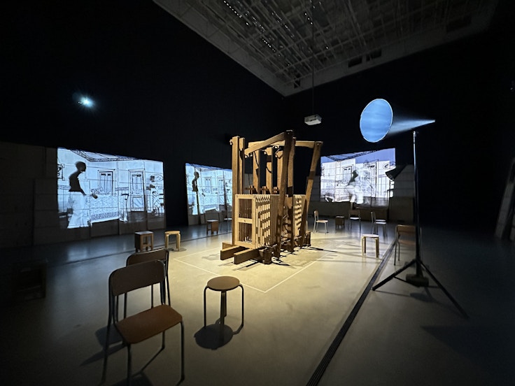 ウィリアム・ケントリッジによる5チャンネル・ビデオ・インスタレーション作品《時間の抵抗》(2012)は圧巻だ。本作は、京都で一度だけ行われた「PARASOPHIA: 京都国際現代芸術祭2015」のプレイベント(2014)で展示されたもので、日本での公開はそれ以来となる。時間と空間、植民地主義と産業の複雑な遺産、そしてアーティスト自身の知的活動について30分間瞑想する作品だ。