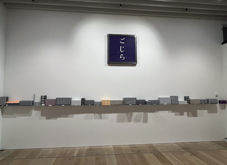 ゴジラとの出会いが作家として活動するきっかけのひとつとなったと語るO JUNは、子供のころから使用するクレヨンの線を重ねたビル群と「ごじら」の文字で、線に込められる人々の記憶とゴジラの発する熱線を交錯させる。