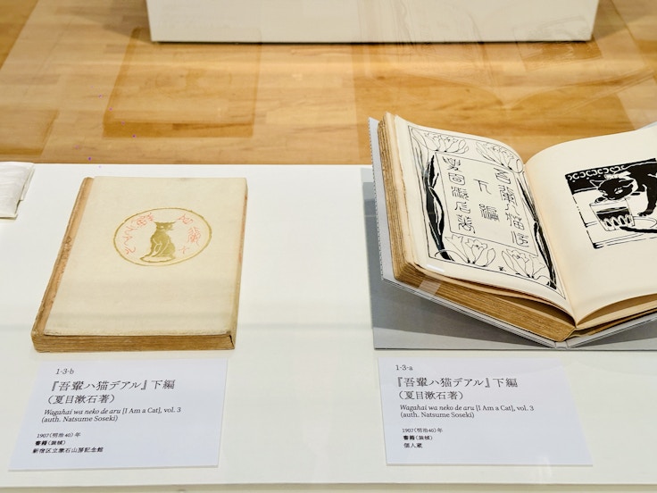 会場には、1905年から07年に刊行された『吾輩ハ猫デアル』(上中下編)の実物とともに、それぞれのジャケット画稿や下絵、表紙画稿などを展示。名作とされる装幀が生まれた過程をたどることができる。装幀・印刷用語の解説があるのも嬉しい。