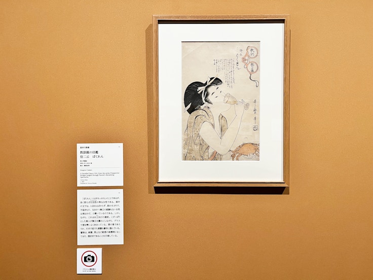 喜多川歌麿は、女性の多様な姿を描くことに長けた、美人画の旗手とも言える浮世絵師だ。会場には、江戸の人々の憧れの的でもあった遊女たちのプライベートな様子を描いた「五人美人愛敬競」シリーズや、女性に対する教訓が絵とともに記される「教訓親の目鑑」シリーズなどが展示されている。美しく淑やかな女性のみならず、時には悪女のような人物も魅力的に描くなど、その多面的な姿をリアリティをもって表現している点が、歌麿の大きな特徴と言えるだろう。