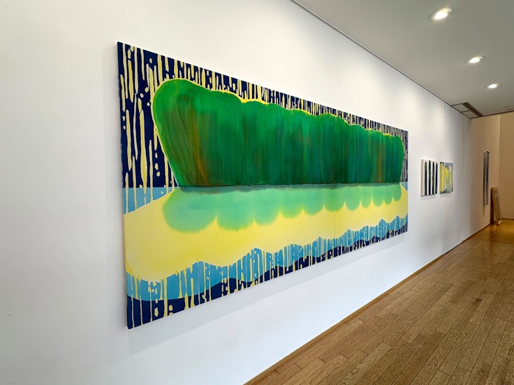 末松は、生の体験や感情を起点に、色やかたちを滲みやぼかしのタッチで描いていく。水にうすく溶かしたアクリルを何層にも重ねて制作する方法を用いており、なにものにも縛られないスタンスを表現する末松の軽やかさを感じさせる。