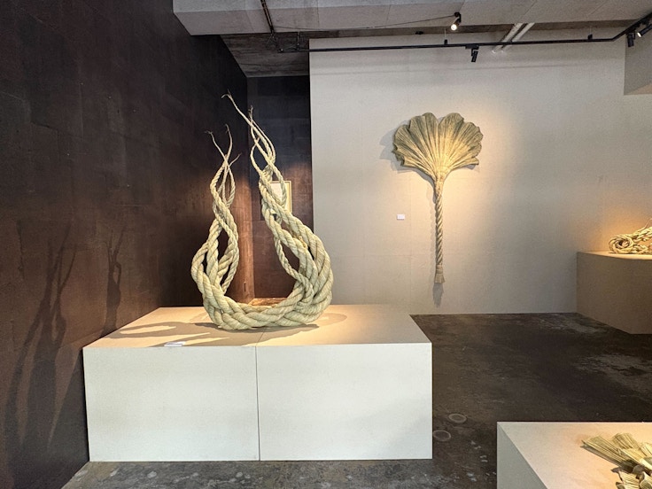 中央エリアに位置するWA.Galleryでは、藤井桃子 個展 「シリクメナワ 2025」が開催中。藤井は京都出身の藁細工の作家で、稲作した後の稲藁を使って作品を制作する。地元の人に藁細工を習い、その造形美や工夫に魅せられたのが制作のきっかけだという。作品制作以外では、神事で使うしめ縄や草履も作っており、和紙を壁紙に使うWA.galleryでの展示空間は、作家の考える藁の神聖さに満ちているように感じられる。改めて、元来日本人が当たり前のようにしてきた、日常の中で様々なことに感謝の気持ちを抱く習慣を思い出すきっかけになるだろう。