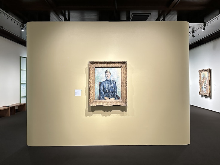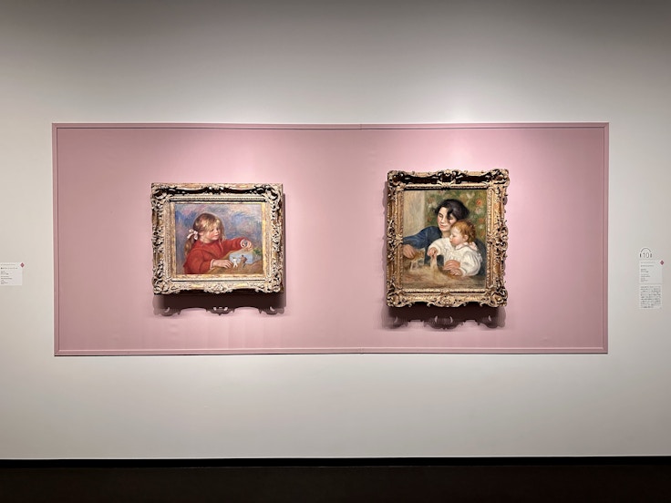 例えば肖像画では、ルノワールの《ピエロ姿のクロード・ルノワール》(1909)とセザンヌ 《セザンヌ夫人の肖像》(1885-1895)。ルノワールはたびたび、自身の子供をモデルにして制作しており、縦に長い画面、大理石の大きな柱のある背景には、ヴェラスケスやゴヤの宮廷肖像画の伝統が感じられる。いっぽうセザンヌは妻・オルタンスが室内でポーズを取る肖像画を多く描いた。ルノワールとは対照的に、背景には具体的なモチーフが描かれていない。顔もぼやけており、静物画のように人物をとらえている。