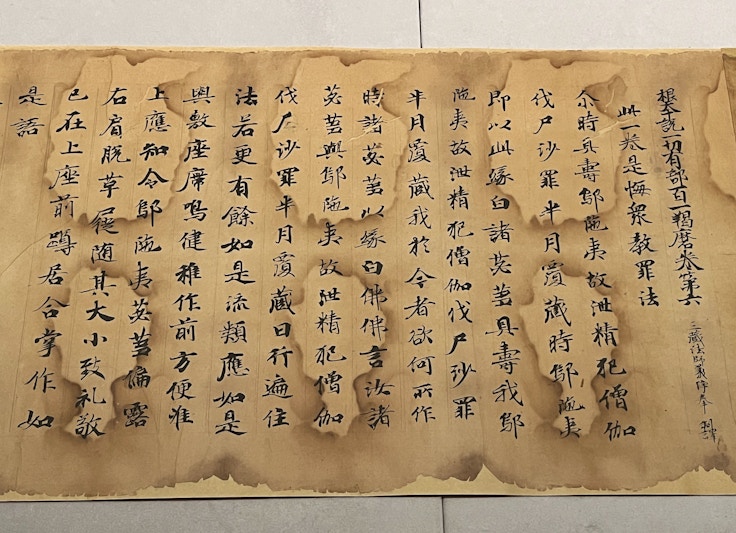 国宝の《根本百一偈磨 巻第六》は、教団の運営や宗教行事に関する作法を集めた全10巻のうちの1巻。巻第六が白鶴美術館に、残り8巻は正倉院聖語蔵(しょうごぞう)にあるそうだ。表紙や巻物の軸も当時のままという貴重な一作。