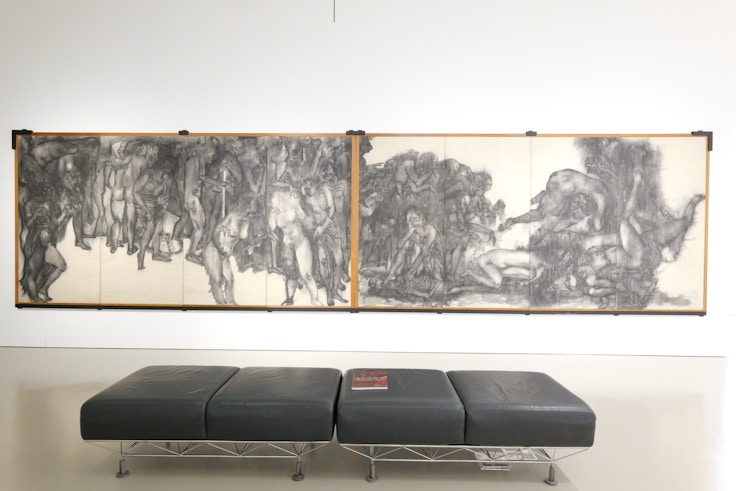 疎開先で原爆投下の報を聞いた丸木位里と俊が、終戦後に広島の家族などから聞いた体験をもとに描いた《原爆の図》。本展で展示されているのは、アメリカでの展示を前に紛失に備えて制作された「再制作版」であり、全国を巡回して原爆の被害を戦後も広く伝えた。